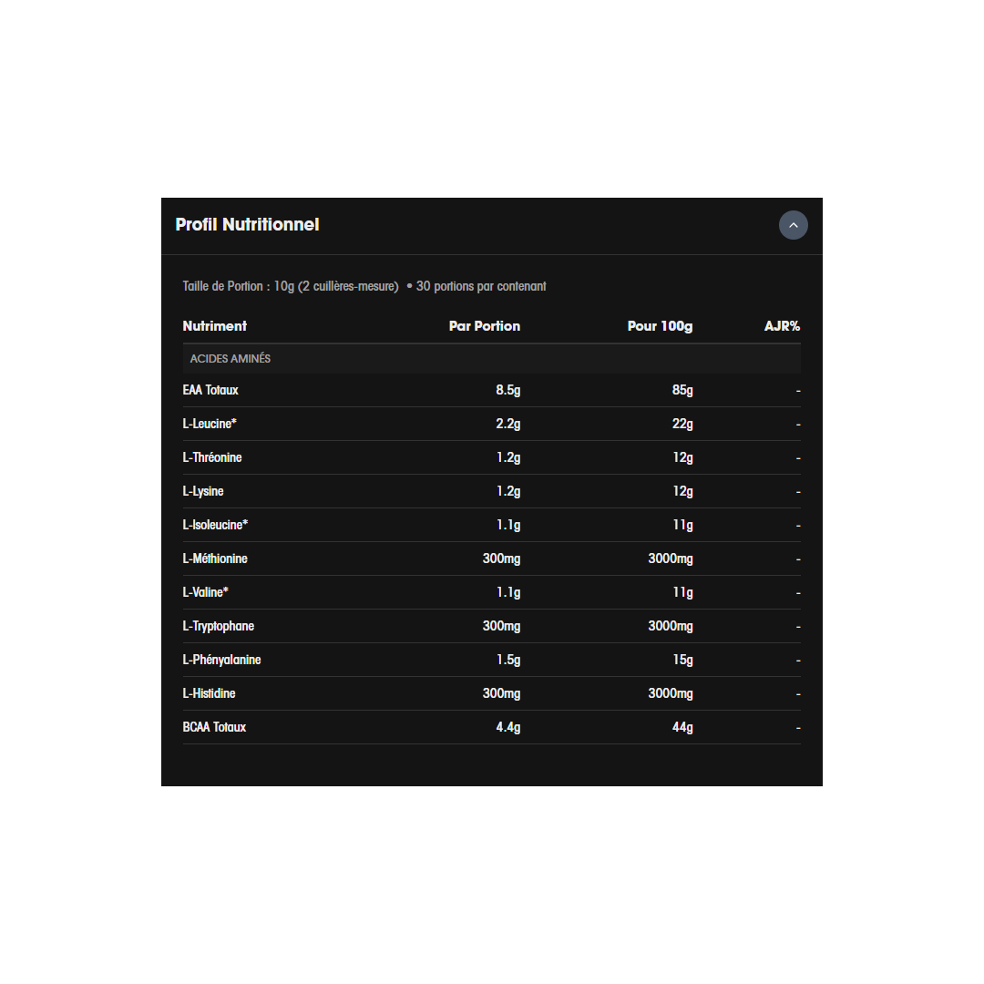 La synthèse protéique obéit à la loi du minimum : elle s’arrête dès qu’un seul acide aminé essentiel vient à manquer. En incluant l’Histidine, IMPACT NUTRITION garantit qu’aucun “goulot d’étranglement” métabolique ne vienne freiner votre progression. Nos EAA constituent la solution “clés en main” pour garantir que votre métabolisme dispose de toutes les briques nécessaires à chaque instant.