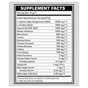 Complément alimentaire. Avec édulcorants. Contient de la caféine (200 mg / portion de 8,75 g ; 400 mg / portion de 17,5 g) ; déconseillé aux enfants et aux femmes enceintes.