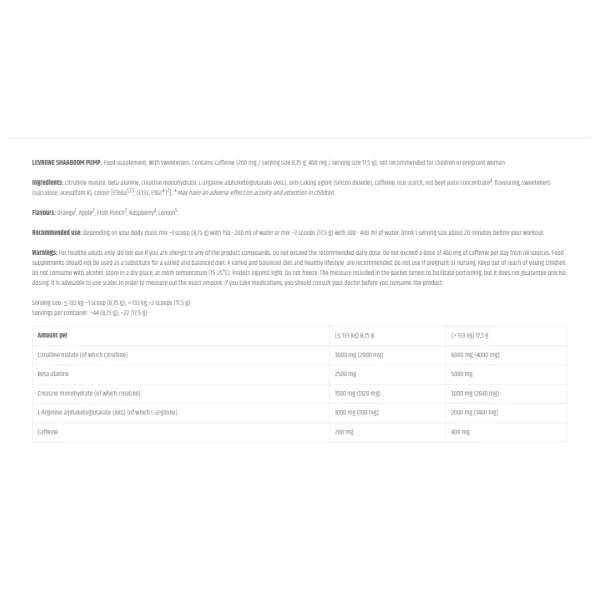 Mode d’emploi recommandé : Selon votre masse corporelle, mélangez ~1 dose (8,75 g) avec 150 à 200 ml d’eau ou ~2 doses (17,5 g) avec 300 à 400 ml d’eau. Boire 1 portion environ 20 minutes avant l’entraînement.