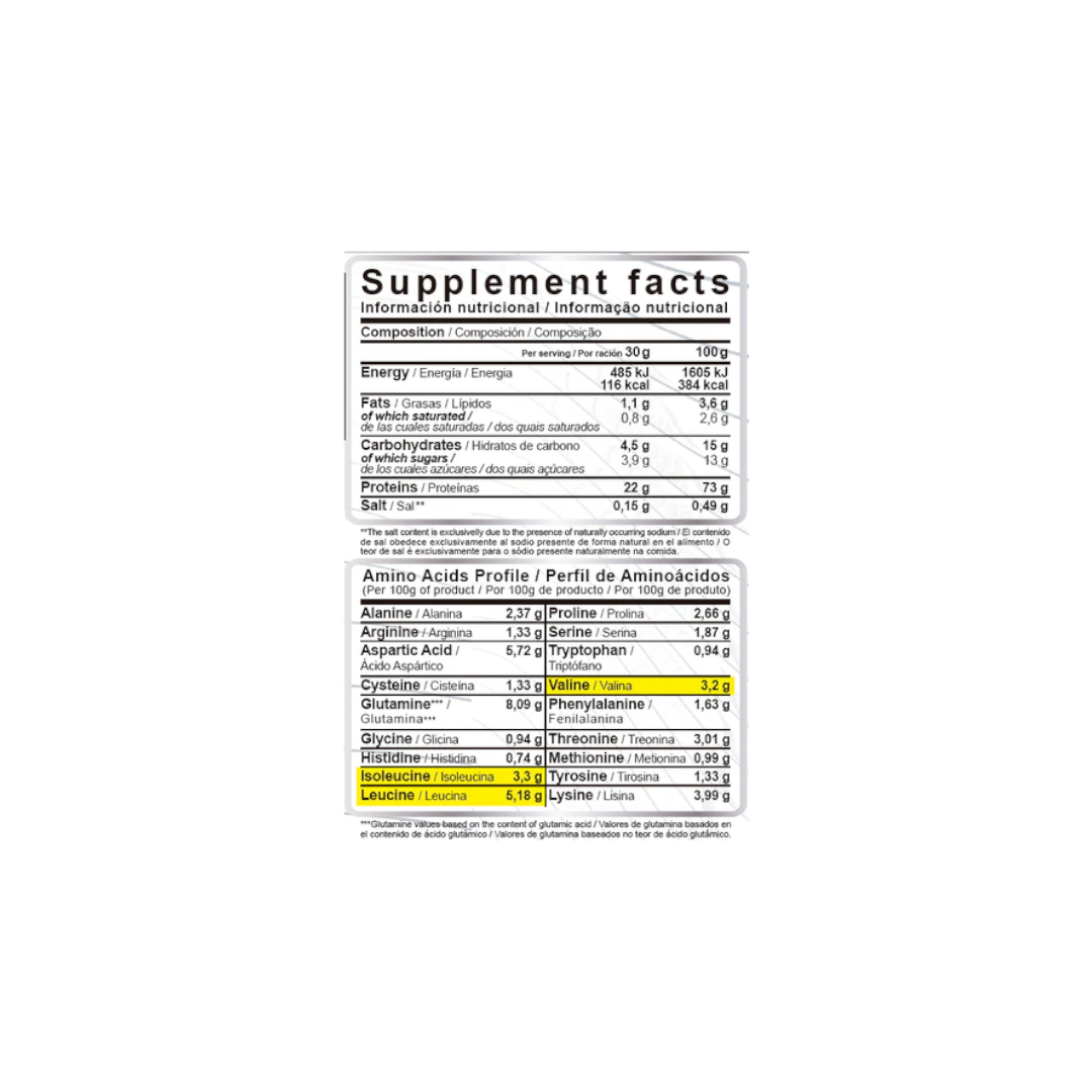 Concentré de protéines de lactosérum (émulsifiant : lécithine de soja), lait écrémé en poudre, glycine, créatine, taurine, arôme, épaississant : gomme xanthane, colorant : bétanine, régulateur d’acidité : acide citrique et édulcorant : sucralose.
