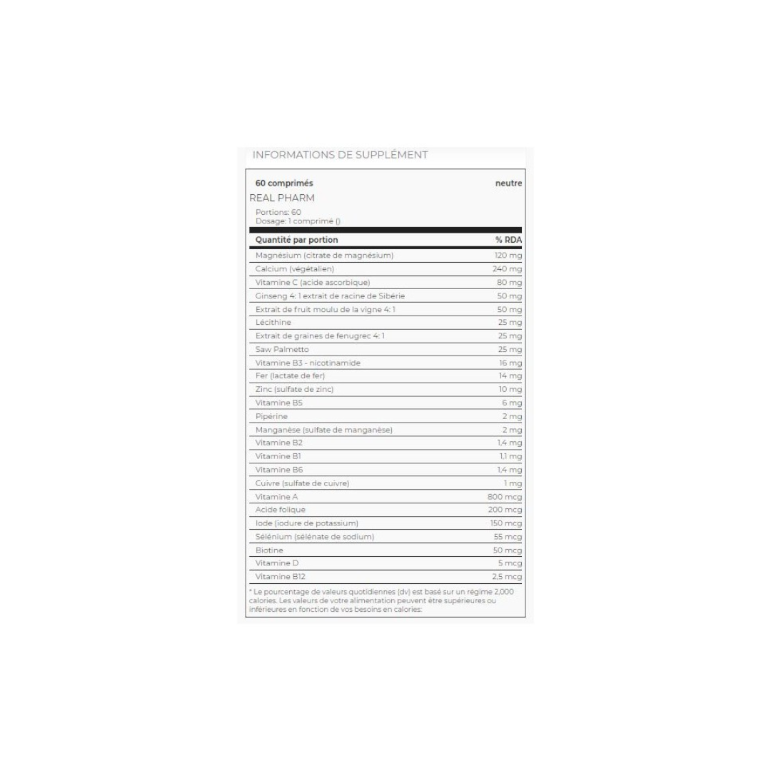 Vitamax Men Real Pharm est supplément multivitaminé et minéral énergisant, contient des micronutriments et des extraits de plantes.ce complément alimentaire est spécifiquement conçu pour les hommes qui pratiquent des activités sportives intenses.